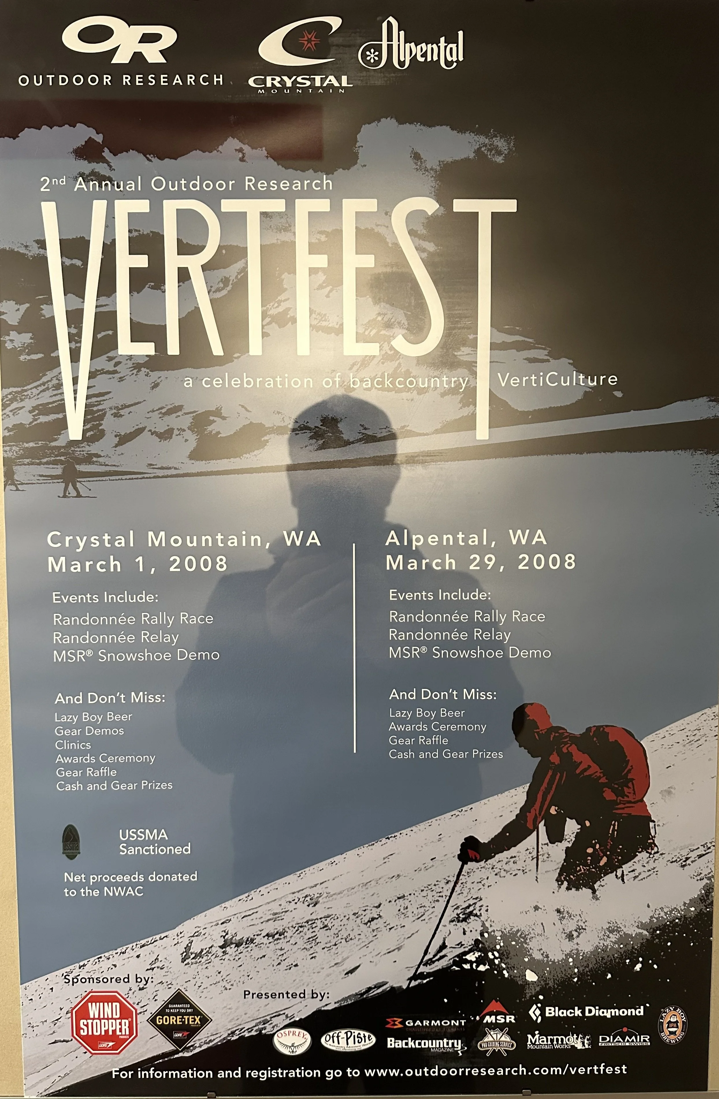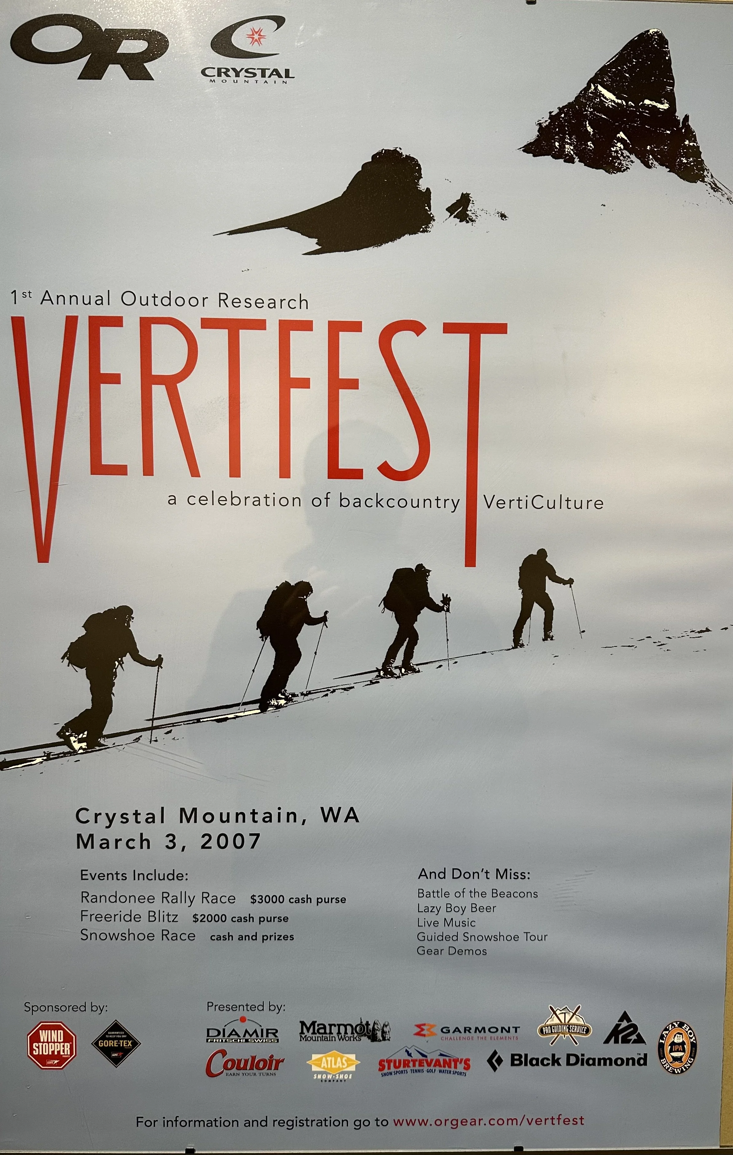Dan’s renaissance of the brand focused around his marquee event, now a series branded “Vertfest”, a celebration of backcountry VertiCulture. According to OR: VertiCulture (n): The totality of socially transmitted behavior patterns of human powered adventurers; a predisposition to engage mountainous, vertically oriented terrain with a variety of tools in all seasons. His connections at Crystal Mountain allowed the event to expand to a race there in 2007, Telefest at Hyak, the biggest race at Alpental. The Crystal race continued for two more years before organizational hurdles caused that race to be eliminated from the schedule.